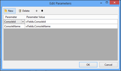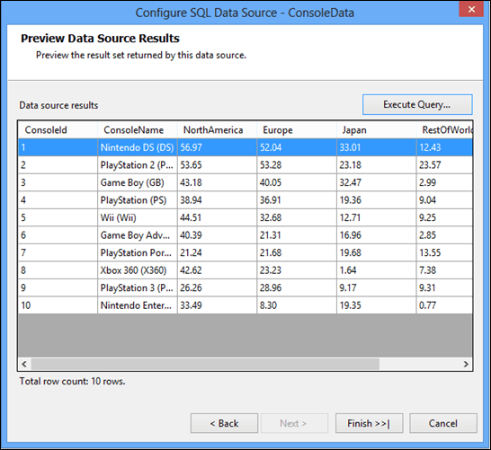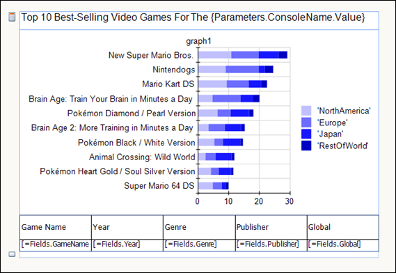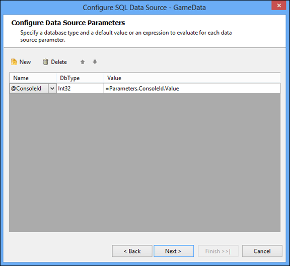 NorthAmerica, Europe, Japan, RestOfWorld, GlobalFROM GamesWHERE (ConsoleId = @ConsoleId)When setting up the data source parameters, ensure to set @ConsoleId to be the value of the ConsoleId report parameter, and for design-time, you can set the value to 1.