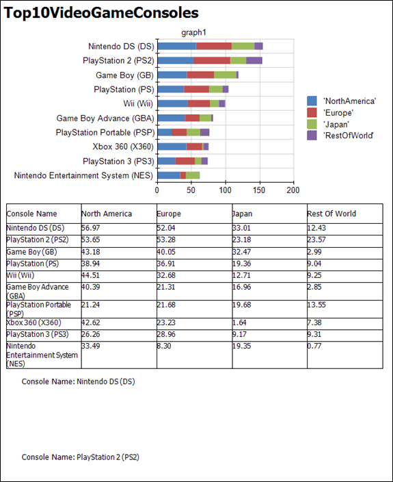 Now when you preview the report, you will see the sub report is rendered in the main report as the details of each video game console. This was accomplished through passing report parameters from the main report into the subreport.