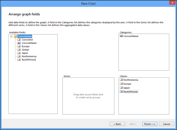 Next drag the ConsoleName field to the Categories box. Drag the NorthAmerica, Europe, Japan and RestOfWorld fields to the Values box, remove the Sum function by clicking the ellipsis button and selecting “None” for each of these fields.