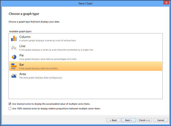 Resize the main title textbox so that we can add more items to the report header. From the Telerik Reporting toolbox, drag an instance of the Graph Wizard into the report header section under the title. In the wizard, select the already existing ConsoleData data source, and select to create a Bar graph, ensure you check the checkbox so that we create a stacked bar graph.