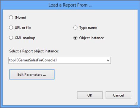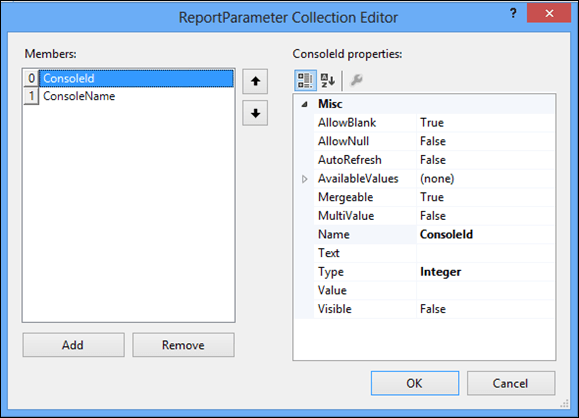 We will be creating the sub report in much of the same way we created the main report. Right-Click the project and add a new Telerik Report to the project named Top10GameSalesForConsole.cs. Cancel out of the Report Wizard this time around and delete the report footer. Next select the report (click anywhere on the background of the designer where there are no report elements), and in the properties, click the Ellipsis in the ReportParameters property. Add two properties, name the first one ConsoleId and it is of type Integer, name the next one ConsoleName make it of String type.
