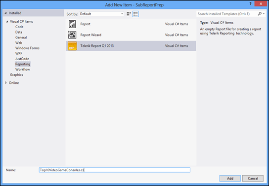 Please take the time now to download and attach the SQL Server 2012 Express database for this article. Once this is complete, open Visual Studio 2012 and create a new C# Class Library project. Once the project is created, delete the default Class1.cs file that is added by default. Right-click the project, and add a new item. Select Reporting and select to create a new Telerik Report class. Name this class Top10VideoGameConsoles.cs.