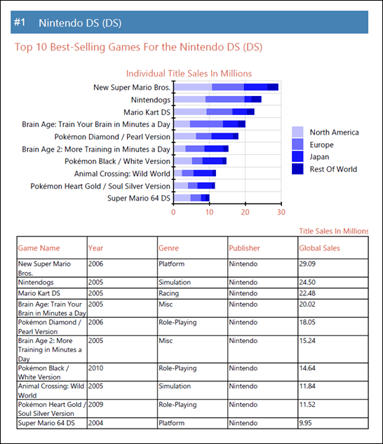 One of the most popular questions asked in the Telerik Reporting forums is how to go about data binding subreports. Subreports are actually full reports, created just as you would create any other report. They are built so that they can be used independently as well as embedded as a subreport within an existing report using the SubReport control from the Telerik Reporting toolbox. Much of the confusion on data binding subreports surrounds how to get data from the main report and use it as parameters feeding values into a subreport. In our example, we are going to create a main report that deals with reporting on the top 10 best-selling video game consoles of all time. For each of these consoles from the main report, we will include details via a subreport that displays the top 10 best-selling video games for that console. You can download a PDF of the final report.
