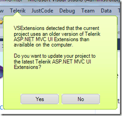When opening a project using an older version of the extensions, the VS Extensions even offer some assistance: