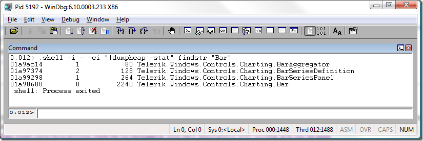 Next you would want to walk through the managed heap and find out what objects are allocated there. You can do this by issuing the following command: !dumpheap –stat. What this will do is list all allocated types, the number of times they are allocated and the total size of each type on the stack. I find it useful to filter through the results if I suspect a certain type leaking. You can do this in the following way: