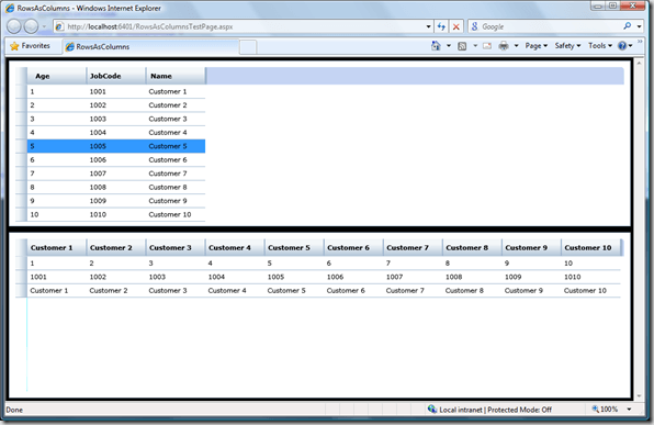 A common scenario when displaying tabular data is to flip the axis so your rows becomes columns and vice versa. This can be easily achieved when you know the shape of your data. For example imagine we have a Customer class with 3 properties:  Name, Age and JobCode. Let’s say that we have 5 customers in our data repository. If we want to select just the names we can do something like this: