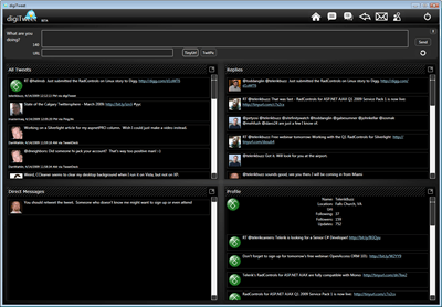 digitweetFor all you tweeps out there, this is a quick plug for the newest Twitter client on the block, digiTweet. I was first alerted to this new client on Channel 10, and just started using it with my account. I must say I am very pleased. For a beta product, this one gets two thumbs up! It’s built with WPF and is open source (you can find it on CodePlex). I also happen to like the sleek interface. Being a .NET guy, I’m partial to apps that are build with .NET (the Twitter client I’ve been using, TweetDeck, was built with Adobe Air). And the good news? It’s got a ton of cool new features coming soon. But don’t take my word for it, go check it out for yourself!