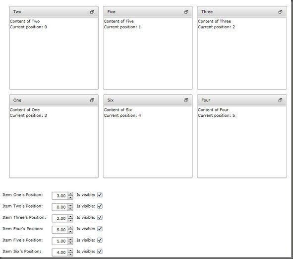 ObservableCollection<TileViewItemViewModel> items = new ObservableCollection<TileViewItemViewModel>{ new TileViewItemViewModel(){Header = "One", IsVisible = true, Position = 3}, new TileViewItemViewModel(){Header = "Two", IsVisible = true}, new TileViewItemViewModel(){Header = "Three", IsVisible = true, Position = 2}, new TileViewItemViewModel(){Header = "Four", IsVisible = true, Position = 4}, new TileViewItemViewModel(){Header = "Five", IsVisible = false}, new TileViewItemViewModel(){Header = "Six", IsVisible = false}};this.myTileView.ItemsSource = items;… and run the application. The output should be something like this: