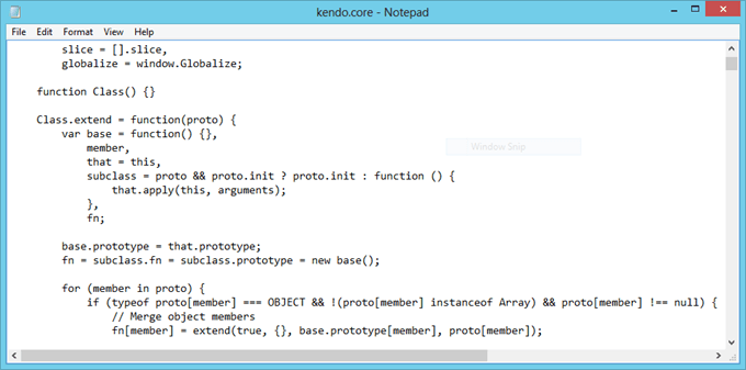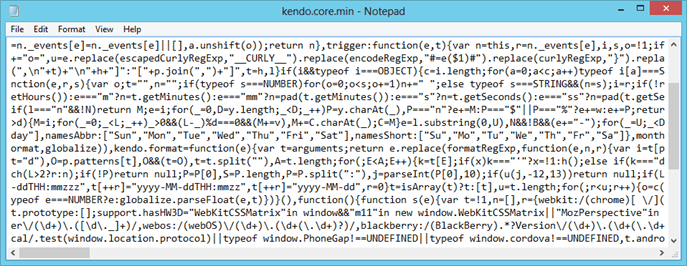 Let's take a Kendo UI file as an example. Here is what the kendo.core.js file looks like (just the top several lines) in it's normal state: