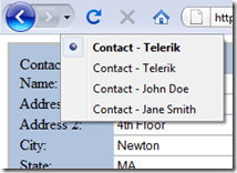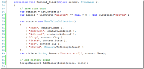 With history enabled in our page, we can now add History Points to our application. History Points can be thought of as snapshots of our application at a given point in time. You can add to a History Point any state information needed to accurately repopulate a page during navigation through the page's history. In this example, I added a History Point to the ScriptManager every time the Button's Click event is fired, which would indicate that a new contact has been submitted. Since this event changes the state of the application, it is a good idea to save the state of the page as that event is processed.