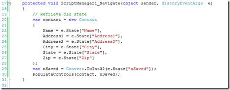 But how does this information get loaded back into the page when a user clicks the back button? Well, notice that in the ScriptManager we also configured it to handle the OnNavigate event. This event is fired when a user navigates to a previous point in the page's history. When handling the event, we simply retrieve the state information from the HistoryEventArgs object passed to the event handler, and then repopulate the page with the data it previously contained.