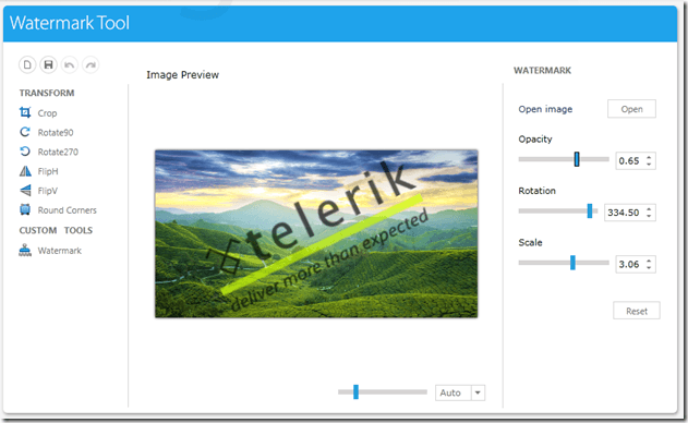 You can create your own custom tool for RadImageEditor quite easily, too. You have to implement the ITool interface, which will give you the ability to setup your own preview, settings UI and attach to any events of RadImageEditor that are relevant to your tool. This offers you the full freedom to implement virtually any behavior you want within your tool. We have highlighted this in the following online demo, where a custom tool for watermarking is available along with its source code. The source code is available when you click the “Code” button in the top right corner of the application.