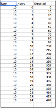 The problem is the vast majority of those combinations don’t test anything different in the system. Instead, you want to check the boundaries of the overtime algorithm. This means use one value above and one below 8, plus perhaps something at zero and 24—the boundaries of the day. You should also have values outside the boundaries of a regular day.