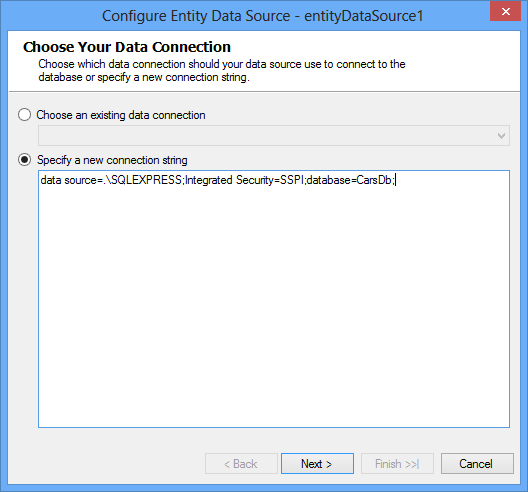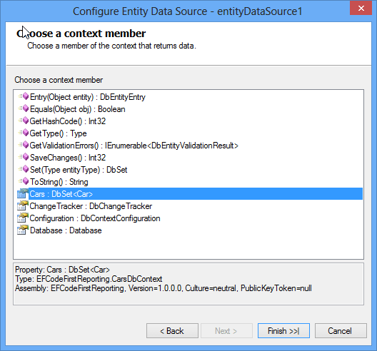You can then choose to save the connection string in the Telerik Report Designer configuration settings for later use. Next you will be prompted to select a context for your Entity Data Source, you will see that our referenced assembly and CarsDbContext are available for selection.