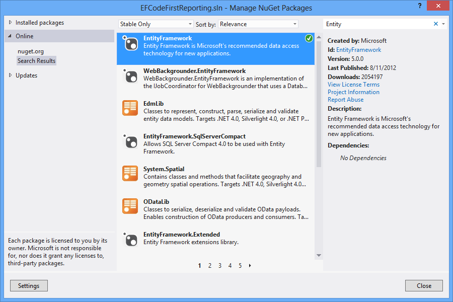 Open Visual Studio and create a new class library project, I’ve named mine EFCodeFirstReporting. Once this project is created, delete Class1.cs.  Next we will want to add the Entity Framework 5 package from NuGet.