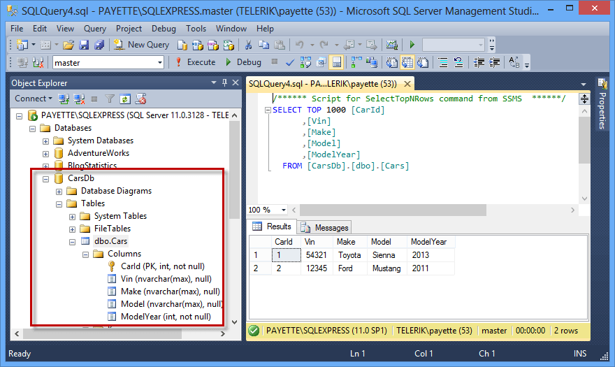 If you open SQL Management Studio you will see that Entity Framework created the CarsDb database to our model’s specification.