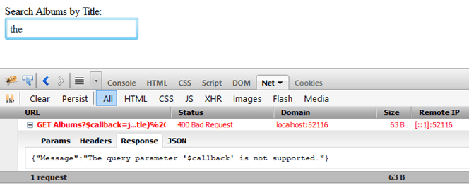 Uh oh, this isn't good. WebAPI tells us: "The query parameter '$callback' is not supported."