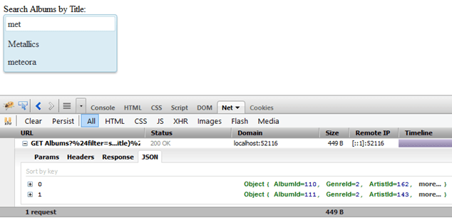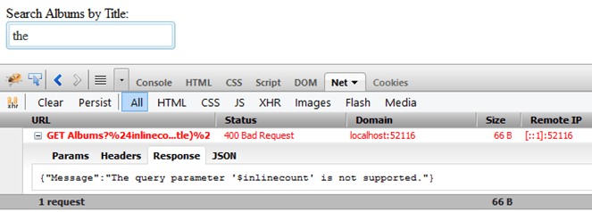 However if we look at the actual JSON response, the very first album returned contained: {"Title":"...And Justice For All"} so WebAPI is ignoring these query string parameters. It is NOT applying filtering (but most of the rest of this article will deal with making it do the filtering).
