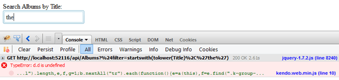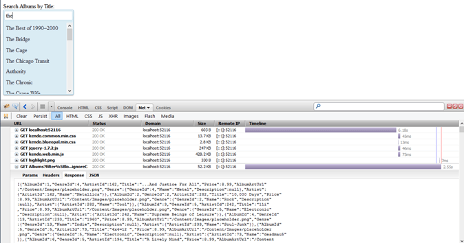I am going to turn this into a Kendo UI AutoComplete widget, and use it to search for albums by their title. I do this using the JavaScript: