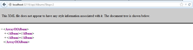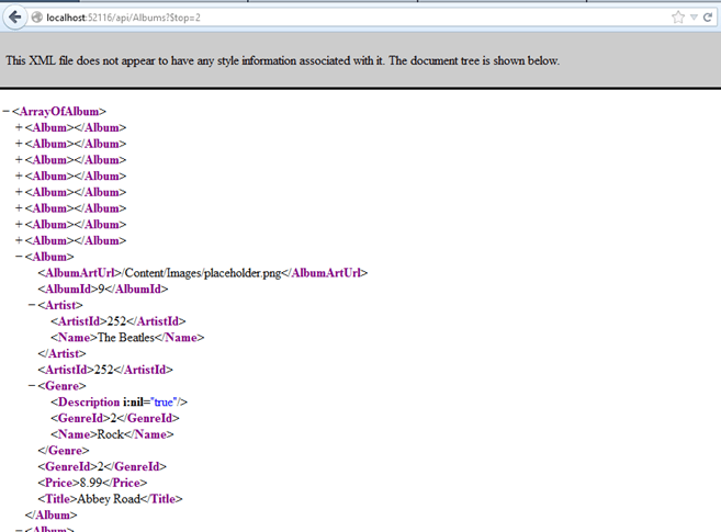 We can test our controller by browsing to “/api/Albums” and seeing that it returns all albums as XML. In my example, the MVC Music Store contains several hundred albums, so this is a large list.