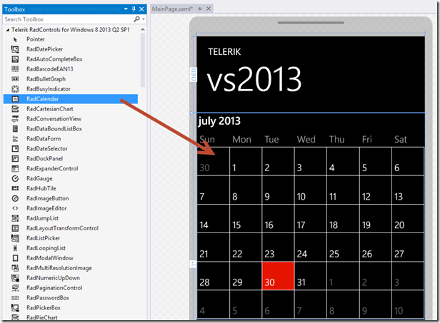Figure 5: Dragging and Dropping RadCalendar from the Visual Studio 2013 Toolbox to the Designer.
