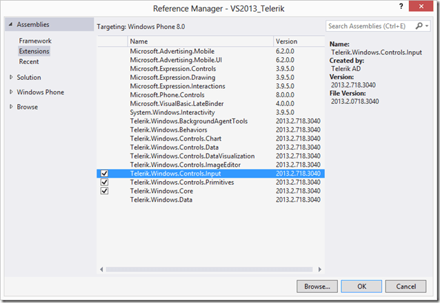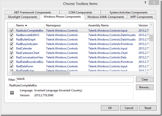 If you don’t see the components listed there, select browse and navigate to the folder called, “C:\Program Files (x86)\Telerik\RadControls for Windows Phone 8 Q2 2013\Binaries\WindowsPhone” and select the components you wish to use.
