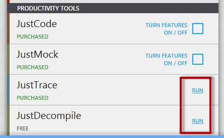 In addition to opening demos and solutions, you can also run actual product applications. Using Telerik Control Panel, you are able to launch JustTrace, Justdecompile, Test Studio and TeamPulse applications.