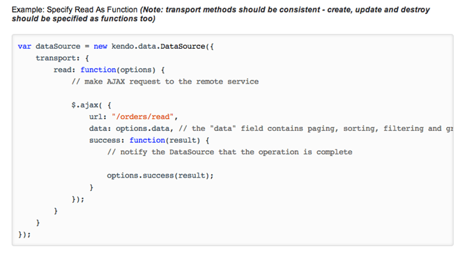 This is what we need! This way we can have the DataSource act like it's calling a remote source, but we'll override the read method to specify a local source instead and return that as the source of the data. The official name for this is a Custom Transport.