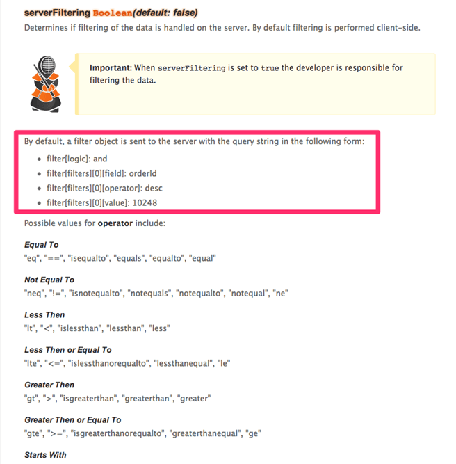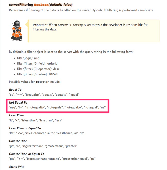 Now we know that the object we need off of the data parameter is filter which has an array of filters. Each filter has value, operator, field and ignoreCase properties. Now we know exactly what kind of object we need to pass in. But what operator do we need? We know it needs to be a "not equals" operator. To know for sure, let's check the docs again. The same serverFiltering topic on the API docs will tell us what our choices are.