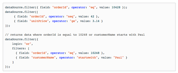 But how do we let Kendo UI know what data to use? If you look at the image above you can see that they are passing the results of their AJAX request to options.success(). That means that we could pass a local set of data to that same method. We just need to filter it first and then pass it in. What we actually need is two DataSources. The first one will just hold the local data and the second will have a function defined as it's read. The reason why we use a second DataSource is that it will do things like filter local data for us. How do I know this? I checked the DataSource API docs and it has a filter method.