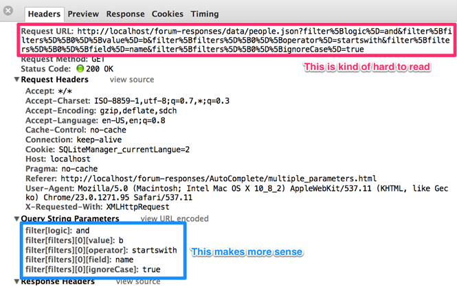 You can see the parameters are being passed into the query string, but they are hard to read because they are url encoded (pink). However the Chrome Developer tools have them parsed out below (blue) for our convenience.