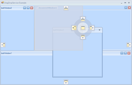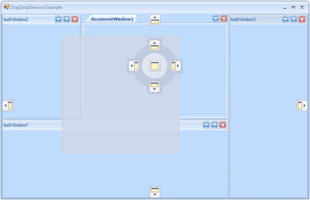 On the screen above, toolWindow3 instance is being dragged. The service has hit-tested the MainDocumentContainer as a drop anchor and the appropriate docking guide is displayed. The “Left” docking position is selected and the service “hints” the user for the approximate position the panel would occupy after a successful “Commit” operation.