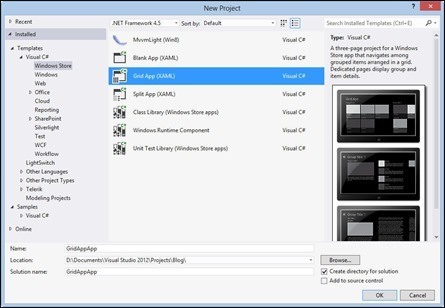 The first step is to fire up Visual Studio and create a new application, using the Grid App (XAML) template under Visual C# Windows Store, as shown in the figure. (Click on the figure to see it full size).