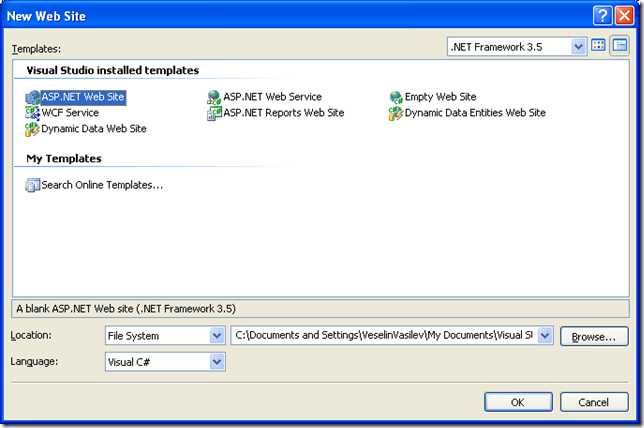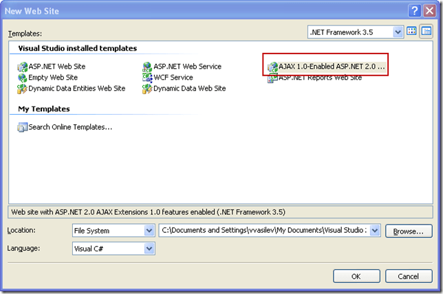 Note that selecting this option will create a .NET 2.0 web site using the Ajax Extensions 1.0 (despite the .NET version in the dropdown is 3.5).