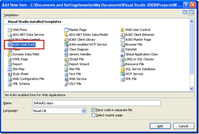 Fortunately, you can download the Microsoft ASP.NET 2.0 AJAX Templates for Visual Studio 2008 from here. After installing them you will be able to choose again your favorite option in Visual Studio 2008 – Ajax 1.0-Enabled ASP.NET 2.0 Web Site: