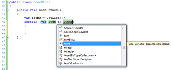 Once you have either fully typed the snippet name or selected it from the intellisense, simply hit TAB,TAB to fully insert the snippet into your code file. For example, typing foreach and then hitting TAB,TAB will insert a parameterized foreach loop into your code.