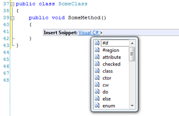 In order to begin using snippets, all you have to do is type the snippet name and it will appear in Visual Studio's intellisense menu.
