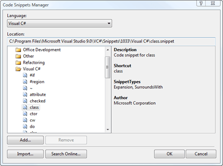 Visual Studio includes a Code Snippets Manager which can be used to browse snippets by language, as well as add, remove, and import snippets. My next post will cover how to add your own custom snippets, but if you'd like to take a look at what snippets are shipped with the IDE, open the Code Snippets Manager by navigating to Tools | Code Snippets Manager... or typing the shortcut CTRL+K,CTRL+B.
