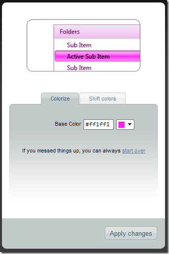 2. The "Hue" slider preserves the offset between colors - that is, newly generated colors relate to each other in the same way as the initial ones. This makes sense if you want to generate themes that are harmonic according to color theory. I guess I'll be posting more on this topic in the future...