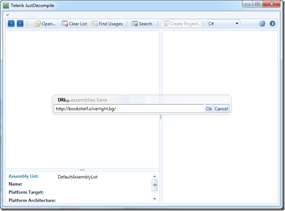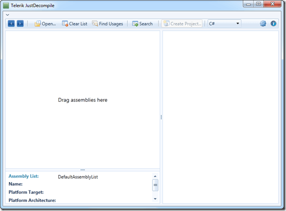 Head over to Telerik.com and click on the Download Beta button. After everything is downloaded and installed then you will see a new icon on your desktop called Telerik JustDecompile. Go ahead and double click it to open JustDecompile. Your screen should look like the following:
