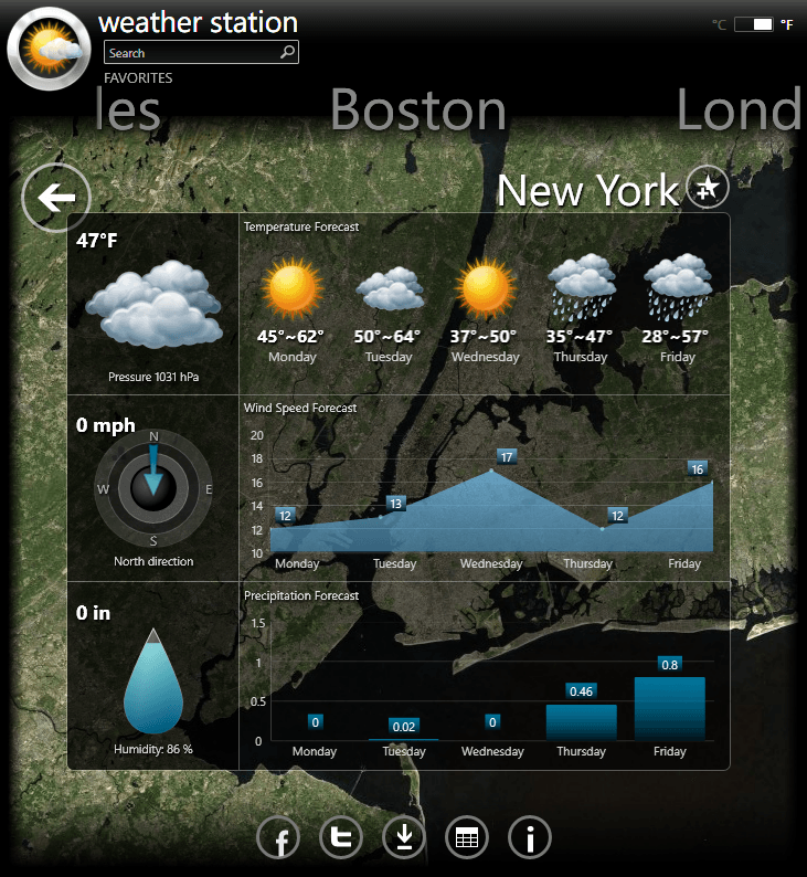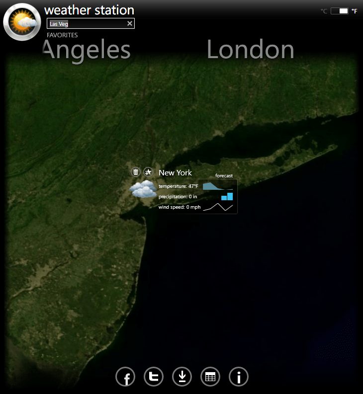 The Weather Station was designed to mimic a real world weather application. By navigating through the map-based user interface, you can both select some of the pre-populated cities as well as utilize the load-on-demand search box to look for other cities not on the map. Not only can you see a quick preview of the weather by hovering over each city, clicking on the weather icon will bring you to a much more in-depth look at the current weather as well as extended forecast. Best of all, you can customize your experience by adding your own locations to favorites for quick access upon returning to their weather station.
