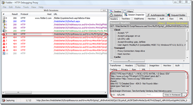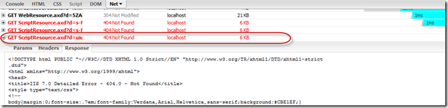 Another useful technique is to use an HTTP traffic sniffer tool - Fiddler for Internet Explorer or FireBug for FireFox. Here are two screenshots showing a failed request to a web resource file: