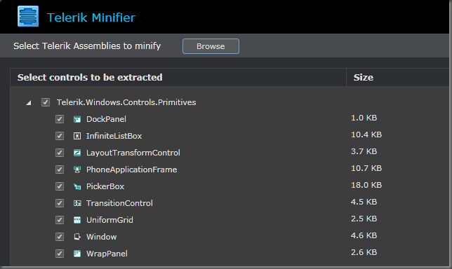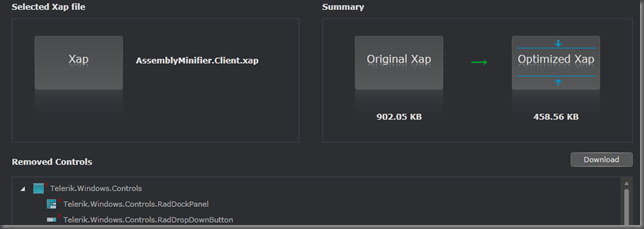It is a huge pleasure to announce the release of Telerik’s new Minifier tool now featuring Xap file minification option. It has been a while since we have released the Assembly Minifier and now we bring the concept for minification and reducing the XAP file size to a new level. We have just released the new Telerik Minifier tool that now features Xap Minification to enable you prune and remove everything that your application does not need from the Telerik assemblies in the Xap. As a result, the size of your application's Xap file will be dramatically reduced. Behind the scenes it uses the Assembly Minifier, to discover what should be removed and what not.