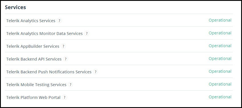 The Telerik Platform makes it easy to rule out issues by showing the status of each service that we provide. Simply navigate over to http://status.telerik.com/ to monitor all of the Telerik Platform services and view additional information such as System metrics and past incidents. You can also subscribe for incidents to be sent to you via email, SMS or RSS. If all the services are operational and you are still stuck, then you may want to log a support ticket before having to replace that nice Das Mechanical Keyboard.