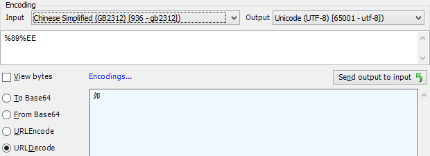 If you’d like to encode text using a non-UTF8 codepage, adjust the Output dropdown accordingly. For example, the Chinese character is encoded as %E5%A4%98 in UTF-8, but if you change the coding to UTF-16, it becomes %18%59: