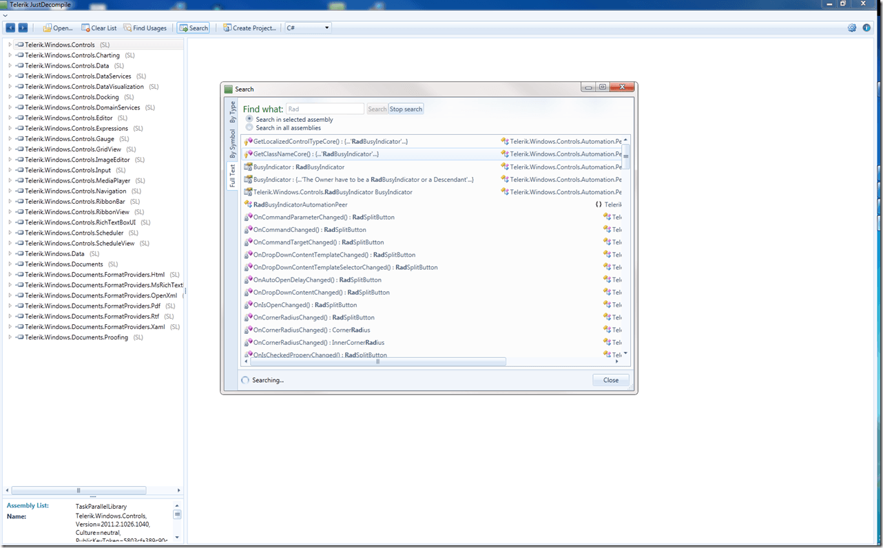 We’re always listening to the feedback provided on the JustDecompile User Voice, and the next feature we’re implementing is free text searching in an assembly. This will allow you to do a full text search in all loaded assemblies to find instances of a particular search term. Here is a screenshot of the prototype, taken directly from a JustDecompile developer’s build!