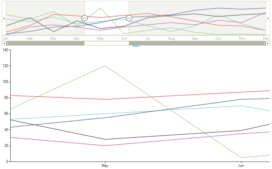 Bring your chart visualizations to the next level! When working with large amounts of data, it is easy for a user to get overwhelmed and lost in a sea of information. RadRangeSelector provides an elegant solution to this problem. RadRangeSelector allows users to focus specifically on a subset of data when they interactively and visually select a range in the chart. This range is then visualized separately on its own allowing users to see and focus on that specific data, free and uncluttered from the rest of the information displayed in the main chart.