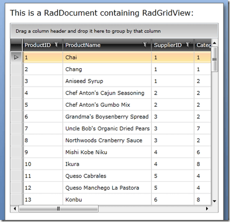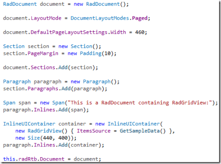 • Here comes the support for embedded Silverlight UI Elements. If you've ever wanted to put a RadGridView within the rich text box, now there is a way using InlineUIContainer: