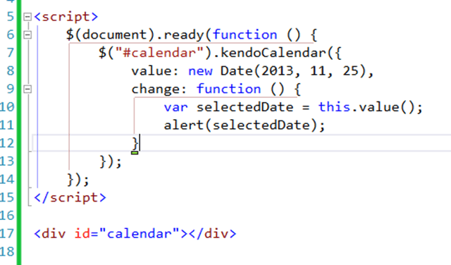 For developers who are comfortable with JavaScript and jQuery, adding Kendo controls to an MVC view is simple. In the example below I’m using the Kendo calendar control. To do this I create a div where I want the control to appear. Then I use the jQuery document ready function to bind my div to the Kendo calendar control: