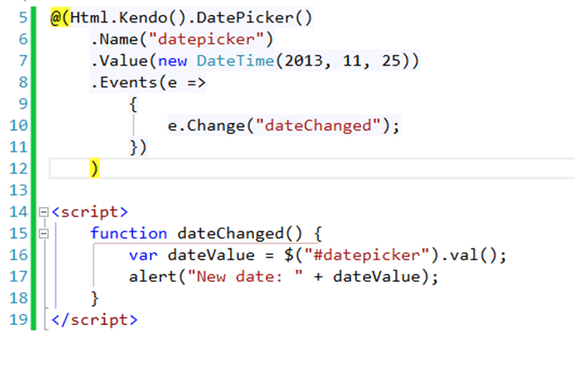 This example differs significantly from the JavaScript only version. For starters I don’t have to define a div where I want my control to appear and then add additional script to create it. In this case I’m calling a method on the Kendo extensions (DatePicker) right where I want the control to appear. This method of adding controls to MVC view is a more familiar and comfortable for most ASP.NET MVC developers.